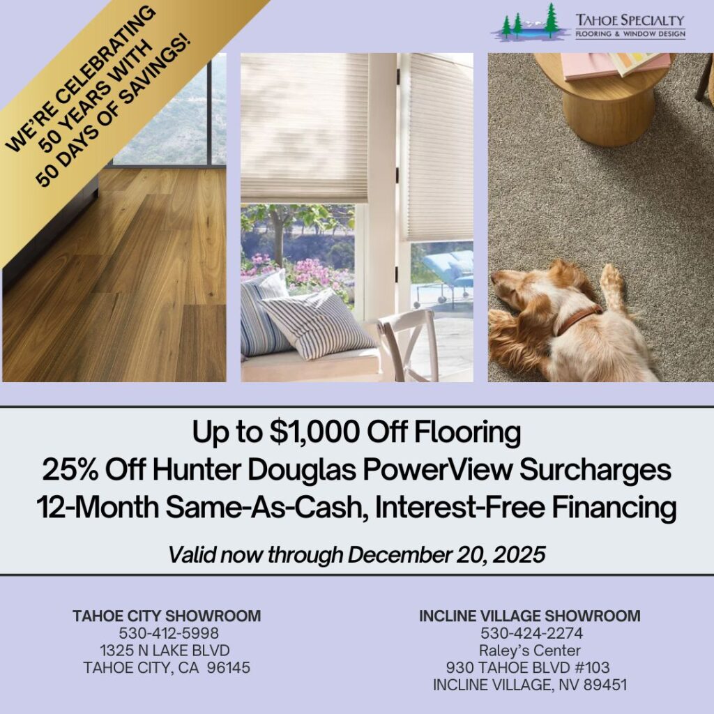 "We have received excellent service from Tahoe Specialty Flooring for several years now. In a small mountain community, where you might not expect such high standards of service and quality products, they truly deliver. We have used them for flooring and window coverings … all with beautiful outcomes! I most recently worked with Shawna Ellefson in the office and she was just wonderful.All in all a great place to do business in the West/North Tahoe area!?"